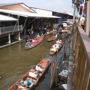 水上マーケットーとメークロン市場のセットツアーを探していたところ、ピッタリのこちらのツアーを見つけ参加させていただきました。水上マーケットに行くまでのモーターボートが思いのほか長く、スピードもあり楽しかったです。到着後、手漕ぎボート(200B/1人)にも乗りました。観光客向けのお土産屋さんが並び、水上から見る景色も面白かったです。メークロン市場は本当に線路ギリギリまでお店があったり、地元の人も買い物していたりとアジアの雰囲気を感じられてよかったです。ぶどうなど、フルーツを買って帰りました。