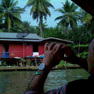ミニバンでバンコク市内から水上マーケットまで行き(途中、ヤシ関係の土産物店に立ち寄り)、そこから水上を裸のエンジン付きの小舟で、水上マーケットまで行きました。この小舟、排気ガスと大きな音を出しながら結構スピードを出すんですよね。波が来ると多少水をかぶるので、さながらレジャーランドのジャングルクルーズ・アトラクションでした。これ、個人的には水上マーケットより楽しめました。