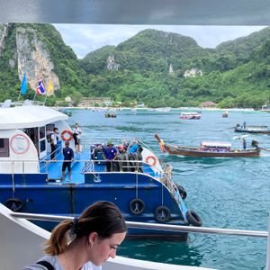 船は40人乗りで半分ほどが日本人だった。ピピ島まで1時間かかり、前後左右の大きな揺れで船酔いされている方もいた。運転手の隣の2人席はつかまるところがありよかった。