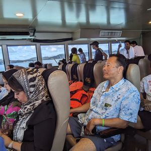 港に到着すると島の税金を徴収される。外で長い説明があり、乗船。シルバー席は2階で、右2列,中央5列,左2列の席であった。ちなみにゴールド席は3階である。飲み物とクッキーの配布があった。出発間際に、シルバー席以外の客が空いているシルバー席に座席変更する。商売のためには致し方ない。ほとんどがインド人系とおぼしき団体。その人たちが特に騒がしかった。携帯もビデオ通話、大きな声で他人さまはおかまえ無。途中でみんなデッキに行ったので多少静かになった。昔で言う社員旅行的ノリ。帰りも同じ。