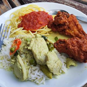 その後、島に上陸して、ランチです。定番のご飯、チキン、スイカなどです。