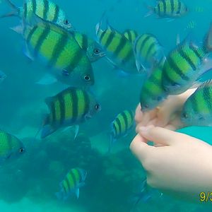 またシュノーケルのときはエサを撒いてたので、沢山の魚が寄ってきて、魚にぶつかって面白いシュノーケルをしました。