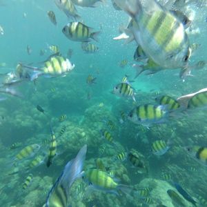 ピピドン島のシュノーケリングスポットでは、船から海にジャンプしました。魚のえさ用のバナナを少しもらって、海に入れると大量の魚が寄ってきます。ヒレが手にパシパシ当たります(笑)魚はとても綺麗です。