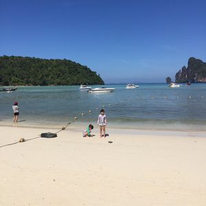 ピピまでは時間が結構かかります。こどもには酔い止めを飲ませていましたが大正解。海は荒れていなかったし、天気も最高でしたが時間が長いので酔う方もいました。優先乗船で好きな席が選べました。ボートで水、オレンジジュース、コカコーラが飲み放題でした。途中サル島は船上から見学、上陸しなくても十分でした。その後、よさそうなポイントで希望者はシュノーケル。必要なものは全て船上で無料貸出なので気軽にみんな海へ。船上からも色とりどりの魚が見えるほど透明感抜群!スタッフも一緒に海へ入ってくれ、シュノーケルの指導もしてくれます。小4のこどもも安心して楽しんでいました。その後、「ツバメの巣」を採るという洞窟を船上から見ながらもうすぐピピ島。到着したらまずはランチ。ビュッフェがすでに用意されており席を決めたらすぐに食べ始められます。食事の時間は十分だと思います。その後、ピピの別の美しいビーチへ。ここは小さなビーチで他のツアー客ともかぶるので人やボートはいっぱいですが・・・写真撮影には十分な時間。カイ島へ向かう途中またシュノーケルポイントで船から入れます。カイ島ではパラソルとチェアでゆっくりしているとパイナップルとスイカを切って持ってきてくれます。魚に与える用にバナナもくれます。海に持って入るとびっくりするぐらい魚が寄ってきて囲まれます!これにはこどもが大興奮でした!十分魚も見られたところで帰途につきます。ガイドさん、船のスタッフは英語で(しかも現地訛り)説明するので聞き取りにくい時もあります。参加者はほとんどが外国人でしたが、母国語が英語ではない方もたくさん参加されていたし、困ることはありません。自分のボートの番号さえ覚えていれば(最初に説明ありますが)迷うこともなかったです。移動は長いですが、途中で海に入れたりするので無駄がなく1日充実していました。こどもも楽しめ大興奮!参加してよかったと思います。