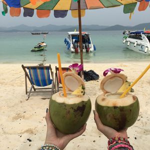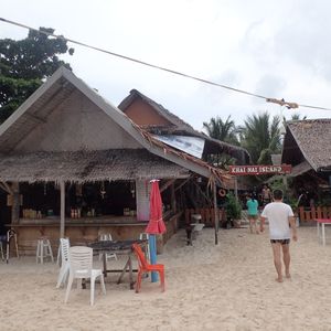 最後の島は1時間半ぐらい取ってそれぞれビーチでのんびりです。パラソルとシートを借りると2人分で150バーツですが、私たちは簡易レストランのようなところのテーブル席でビール飲んでました。ここでスタッフからフルーツのサービスもあり、リラックスできます。