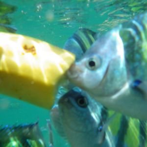 ピピドン島では水着の上にライフジャケットを着たまま、船の周りでシュノーケリングです。手に持ったバナナに熱帯魚が群れてきて楽しいです。防水のデジカメが活躍しました。
