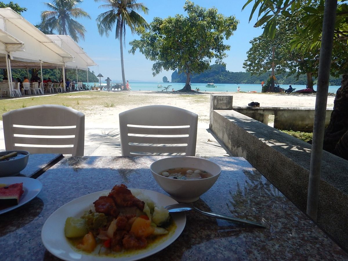ピピ島に上陸後 すぐ昼はビュッフェで タイ料理やパスタ フルーツ スープなど 海を見渡せる席を添乗員さんが確保してくれたりして普通に美味しかったです。