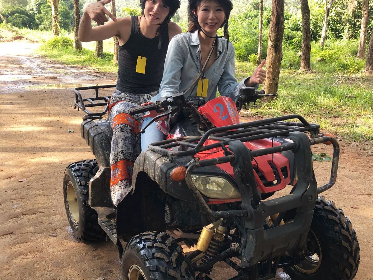 小3,小5と大人二人で参加しました。英語での説明が不安でしたが、写真や実物を操作しながらの説明だったので、なんとなく分かりました。子供と相乗りで、子供と一緒にハンドルを握ったので、運転をしているような感覚だったようで喜んでいました。道のりはでこぼこや水たまりがあり、飽きることなく走れました。1時間コースでしたが、ちょうどよかったです。