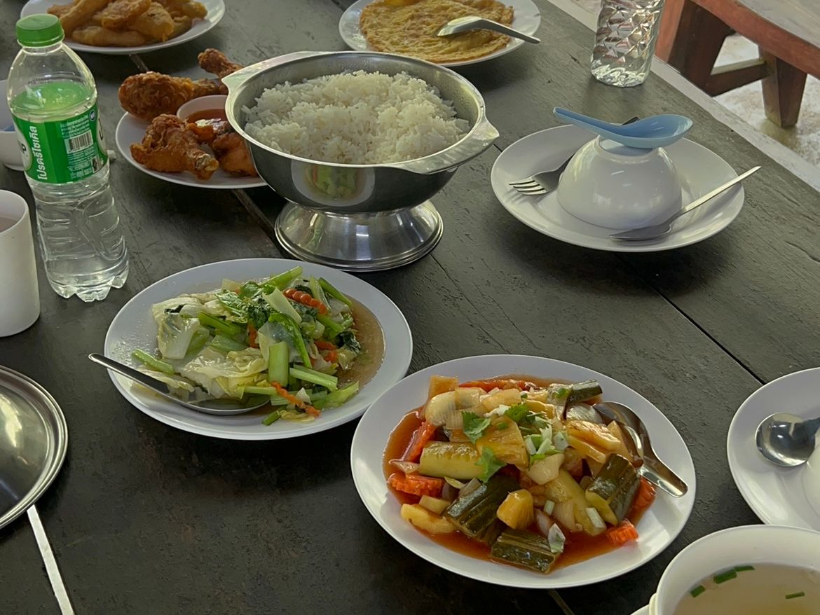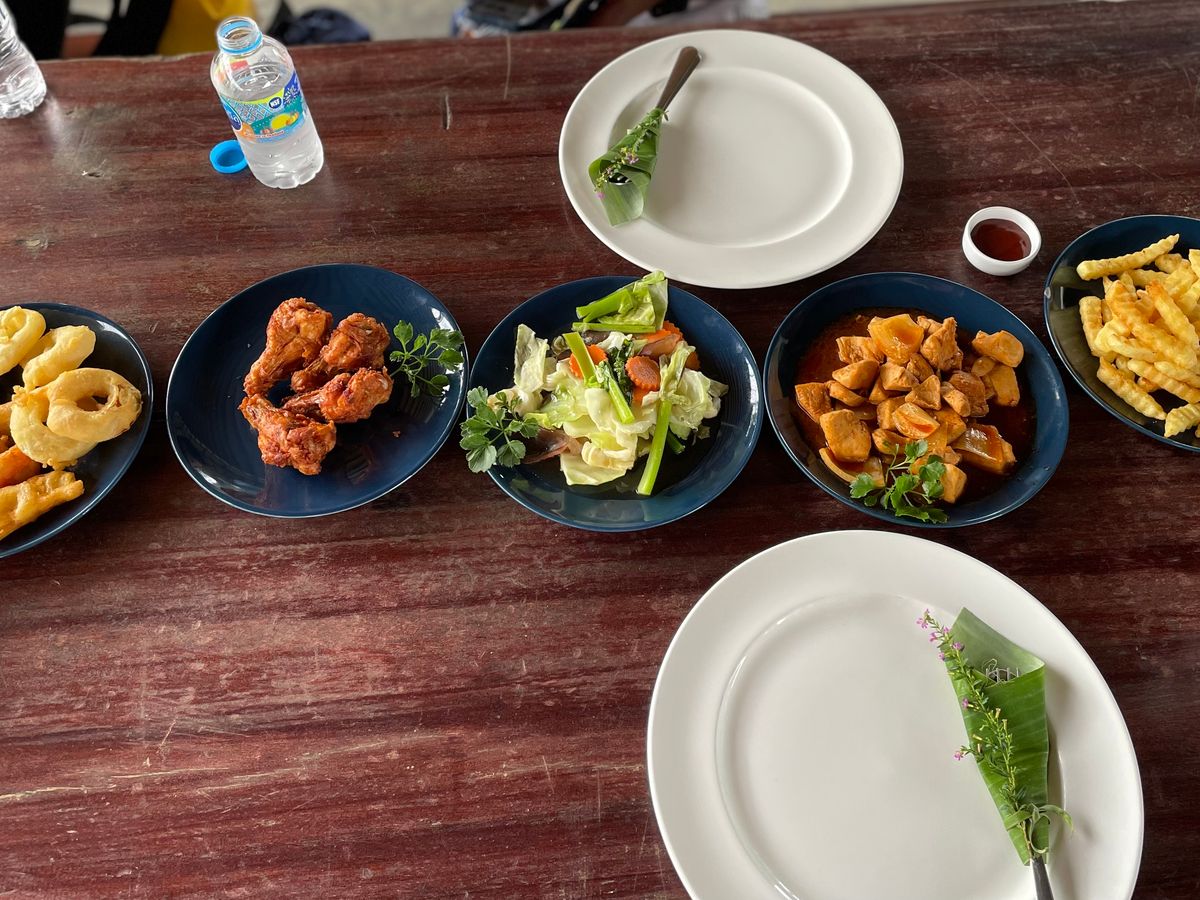 休憩所でランチ。品数はありませんが、定番のライスとチキン、スイカなど、美味しくいただきました。シャワーは水しか出ませんし、シャンプーなどもないので、ホテルに帰ってからでも問題ないでしょう。