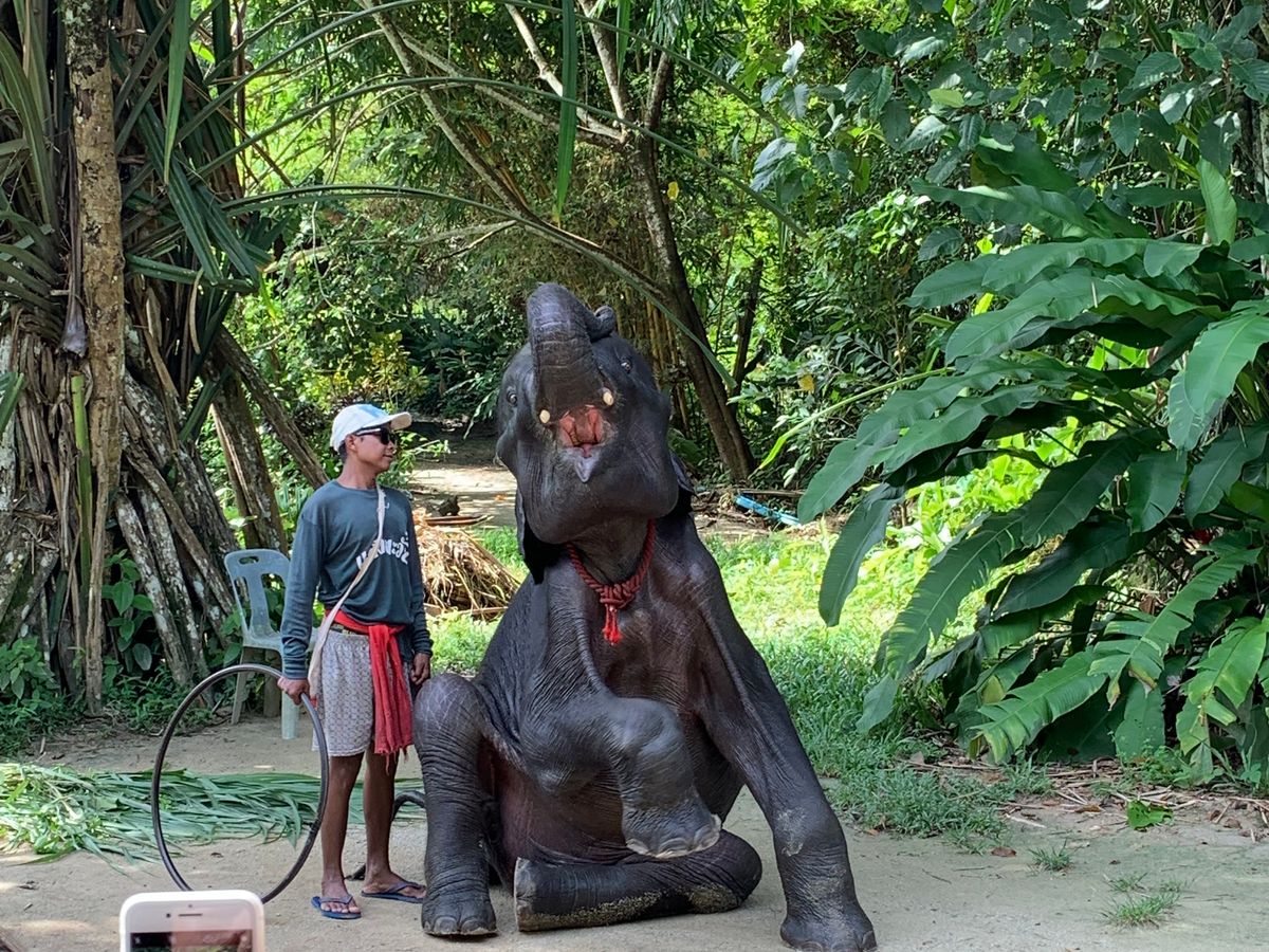 2. 象乗りでは、象使いが象から降りて私たちだけにしてくれ、無料で私のiPhoneで写真を撮ってくれた。象の気分で川に入ってくれて楽しかった。次に仔象のミニミニショー。まぁ無料なので、というかんじ。象が休憩していて、象使いの方が、触ってもいいというので、顔や鼻などたくさん触らせてくれた。これがこの日一番楽しかった。