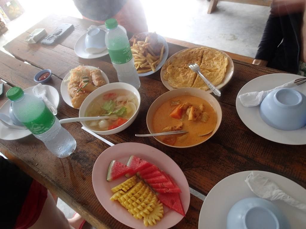 さらにそこから車を走らせてラフティングのキャンプ場に行きました。到着後、着替えてラフティング乗り場までトゥクトゥクで移動しました。ラフティングはボートを漕いでくれる係りの人がいますが、そもそも川にボートを一度に流し込みすぎて、ボートが渋滞していたため、スリリングは少なく、ボートとボートの押し合いでした。ラフティング後の昼食はローカルな味がして、美味でした。その後は山奥の滝に連れて行ってもらい、秘境な感じがとてもよかったです。ジャングルの中を探検しているようで、非日常感を味わえました。