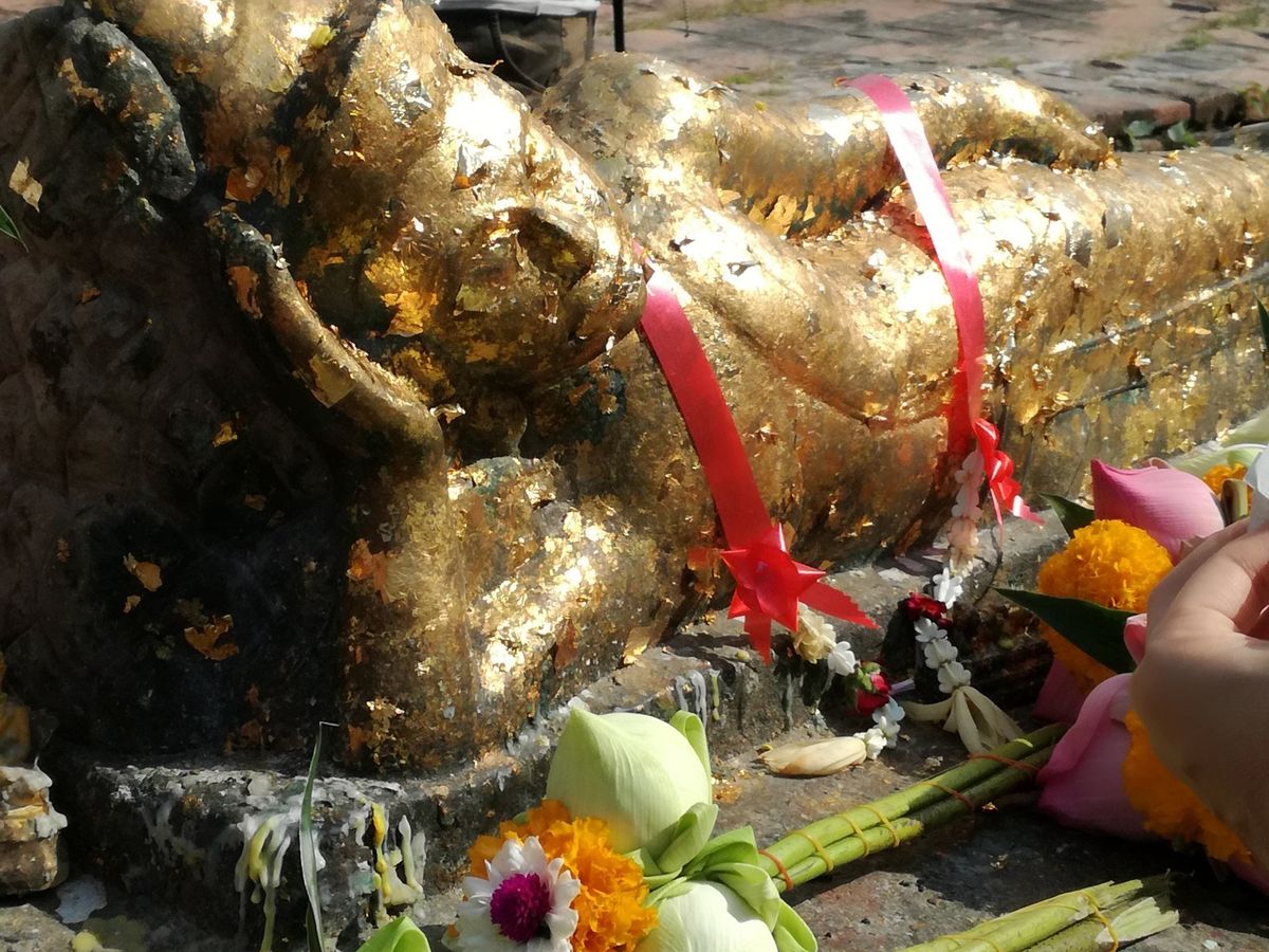 また、ワット・ロカヤスタでは、ガイドさんのサポートの元、実際に金箔を貼ったり、ろうそくを供えたりなどのお祈り体験もさせてもらえました。