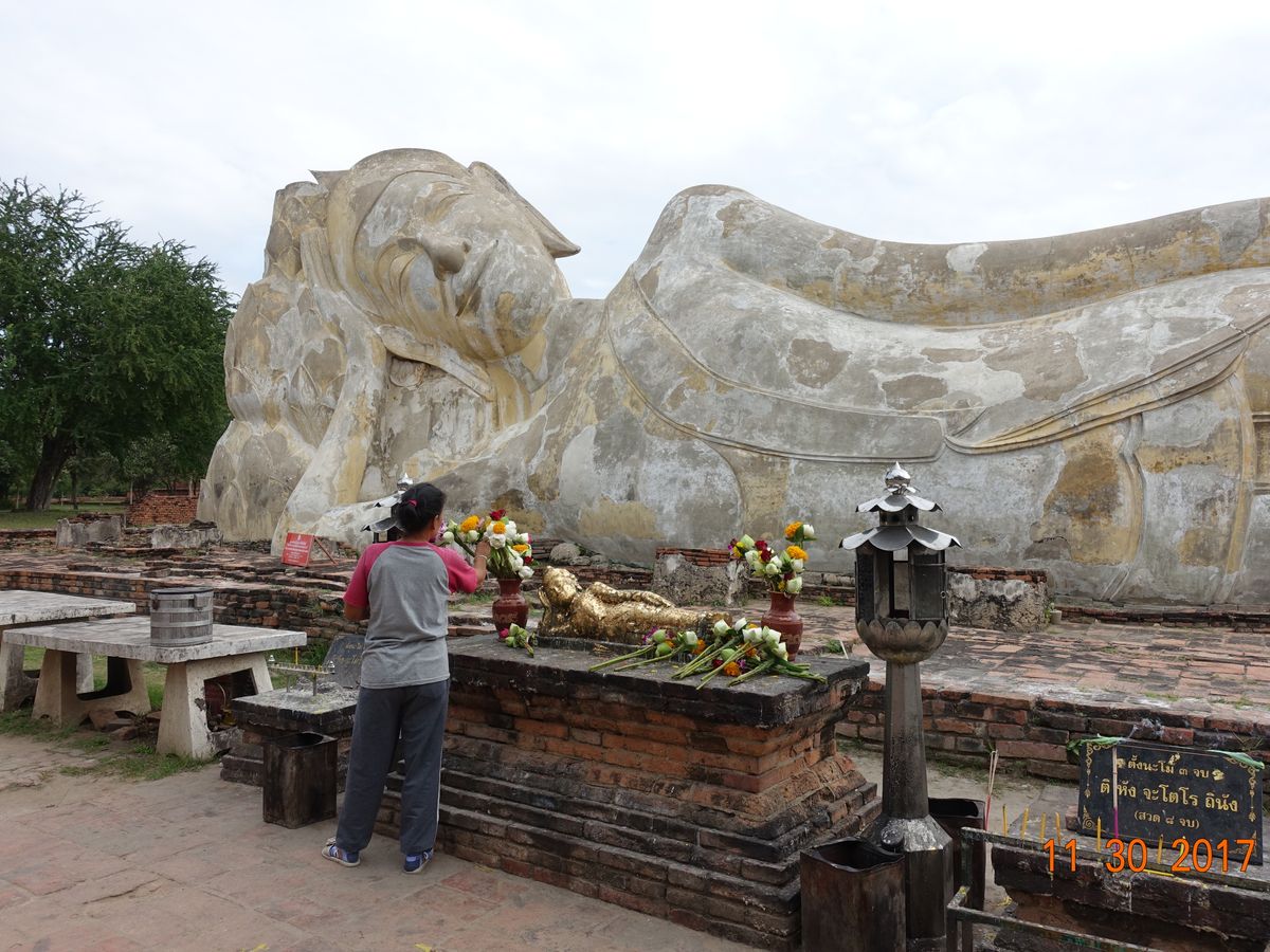 あと、この日の日本語ガイドさんは発音が少し怪しく、時々何を言っているのかよくわからなかったのですが、自由時間にたまたま寺院の講堂で居合わせた際、タイのお参りの仕方を教えてくれたりして助かりました。