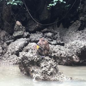 また、マングローブを抜けると猿さん親子も住んでおり、船においてあるバナナ