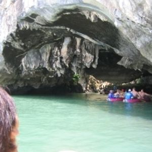 台湾等、世界各国の人と一緒でした。一番目の島に上陸しようとした時又大雨!外国の若い人達は平気で海に飛び込んではしゃいでいました。ジェームスボンド島では銃を構えたポーズで記念撮影!狭い洞窟をカヌーで潜り抜けたり、上陸して洞窟内を歩いたり初めての体験で天気は今一でしたがとても楽しかったです。乾季の晴れた日にもう一度行きたいと思います。