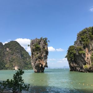 ジェームズボンド岩は人気の撮影ポイントでしたが、島の方に目を向けると、現地の人が大好きな支え合うような形をした大きな岩があり、ちょうどいい高さに指が入る穴に指を引っ掛けて、岩と同じ形で人と人が支え合って立つ、最高の撮影ポイントを専属ガイドに教えてもらいました。
