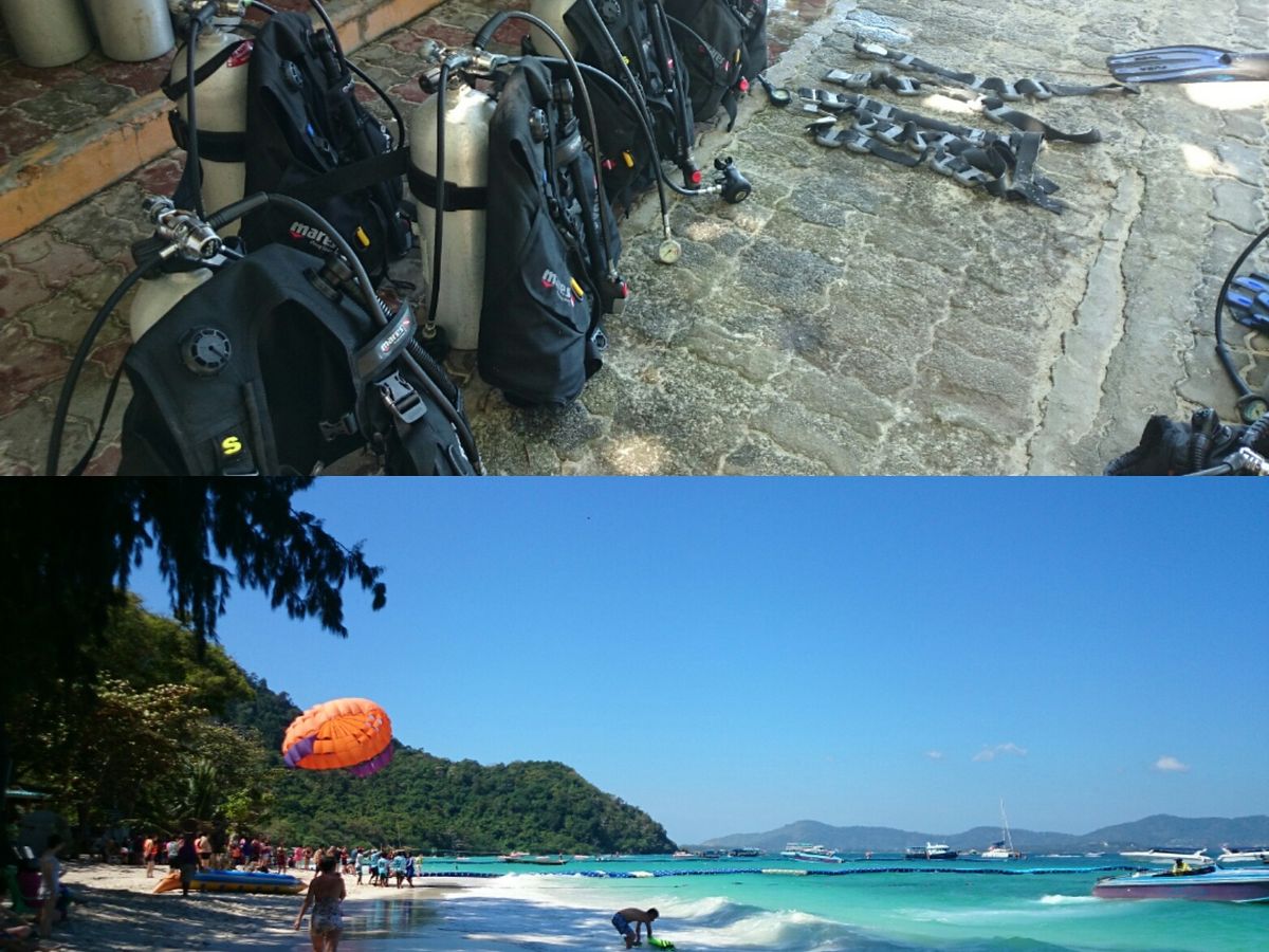 僕たちのグループは午後から体験ダイビングだったので、午前中はパラセーリング(800バーツ/人、ガイドブックには700バーツって書いてたけど…)を体験しました。パラセーリングは小島に移送されて流れ作業でポンポン飛ばされるので、全く緊張することなく大空に舞いました笑