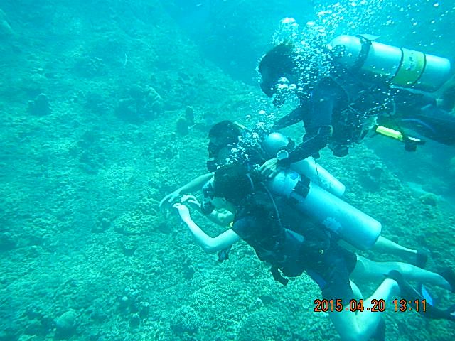 彼女は、初のダイビングだったので