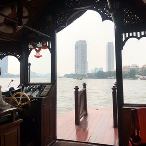 行きはサパータクシン駅からのシャトル船で。車で行くよりずっと気分が盛り上がります。ホテルは思っていたよりずっと小ぶりで、時間まではロビーで待ちました。ウエスタンスタイルとタイスタイルの2つからどちらかを選ぶスタイルでお食事はすべておいしかったです。ベルトラで予約をしていけば、名前を言うだけで予約もお会計まで終わっているのでスムーズでした。
