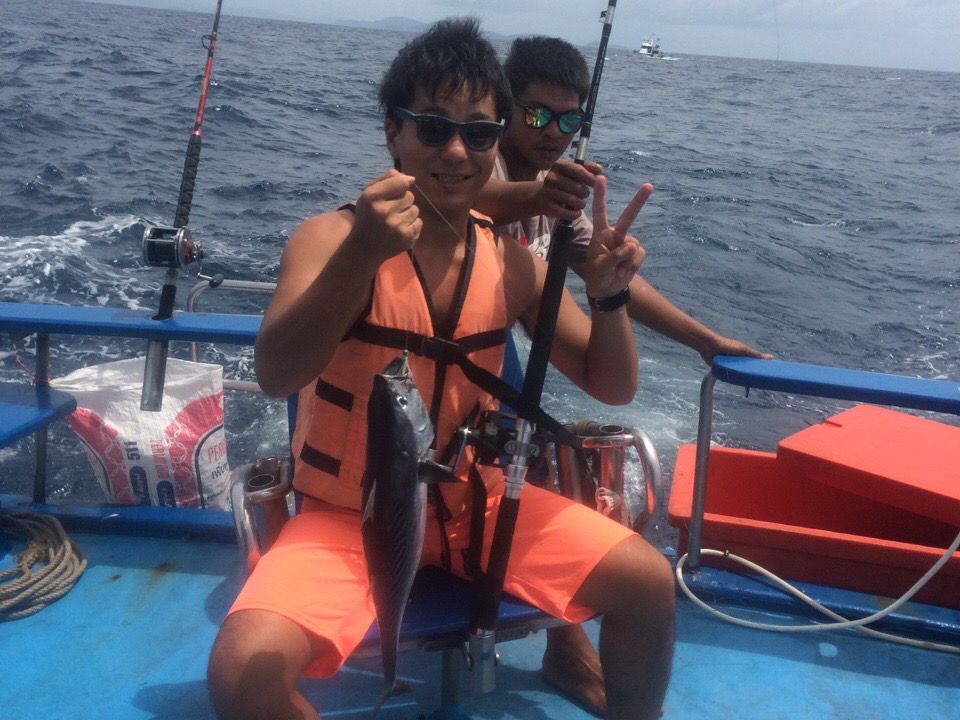 船長さん その助手 日本語を話せる現地人 彼女 僕の5人で出艇。 酔い止めは必須です。(現地の薬局でも買えます) 日本語を話せる現地人はずっと船で寝てました。釣果はまぐろ2匹で 1匹は昼食として お刺身や揚げ物として 頂きました。大きいカジキマグロなどは釣れないみたいです。