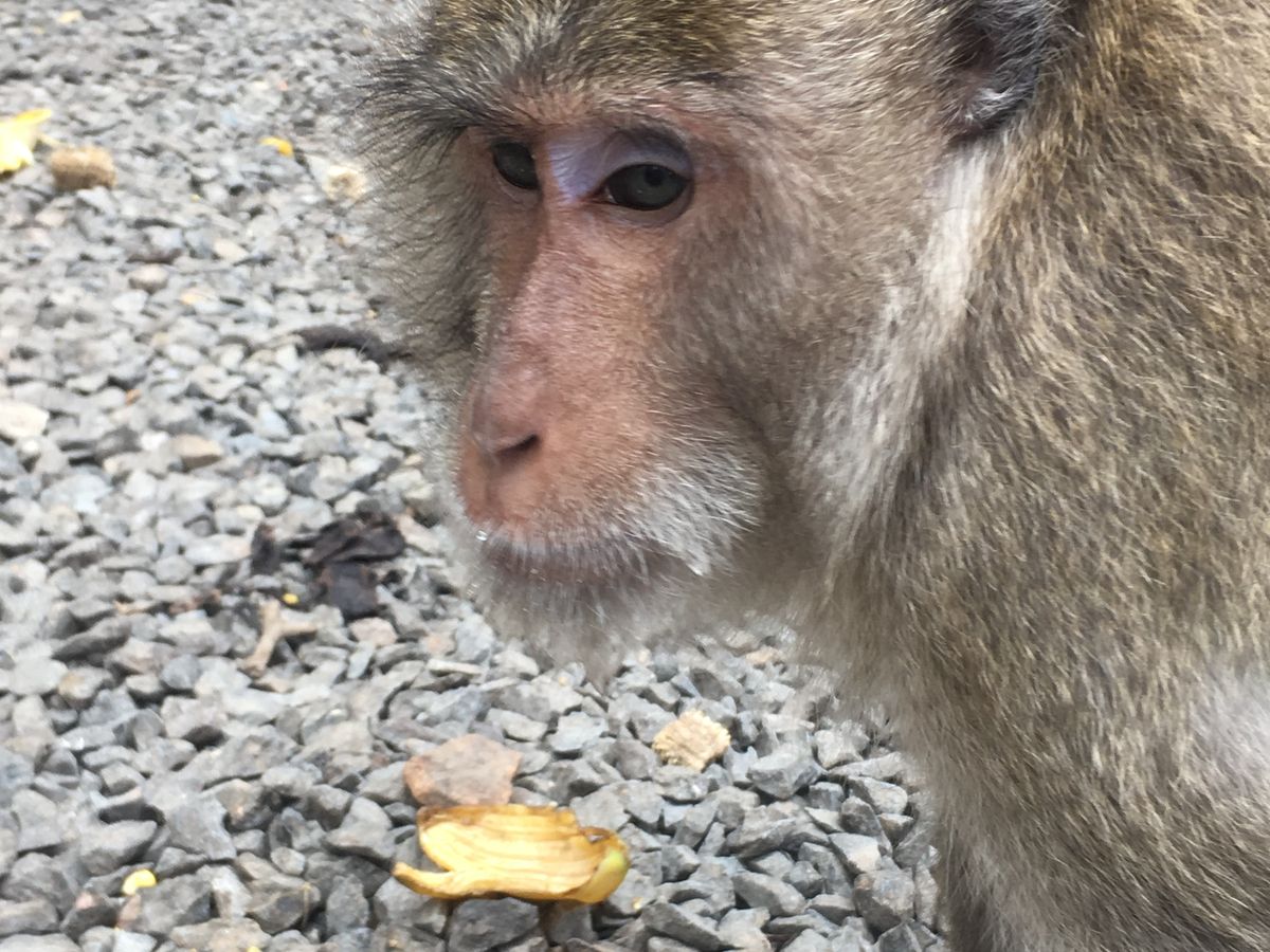 その後、象乗りです。以前タイに来た時も象に乗ったので、大した期待もしていなかった。その時は、広い平坦なグラウンドをただ象に揺られながら1周して終わりでした。ところがところがですよ、今回はなんと急な山の斜面を歩き出したのです。相棒も私も、即緊張し始めました。前後左右に結構揺れるんですよね~。また、食いしん坊の象で時折、道草ならぬ、竹やぶに入り、笹の葉を器用に鼻で丸めて食べながら、余った笹は鼻で巻いたまま歩くのです。最後は、象使いよろしく象の背(いや首根っこのあたりかな?)にまたがり、急斜面を降りるのです。結構長い時間だったようで、象の首周りには私の尻のあとがくっきりと浮き出ていました。決して緊張のあまりオシッコを漏らしたわけではなく、筏下りで濡れた海水パンツのままで乗ったからでしょう。。。。