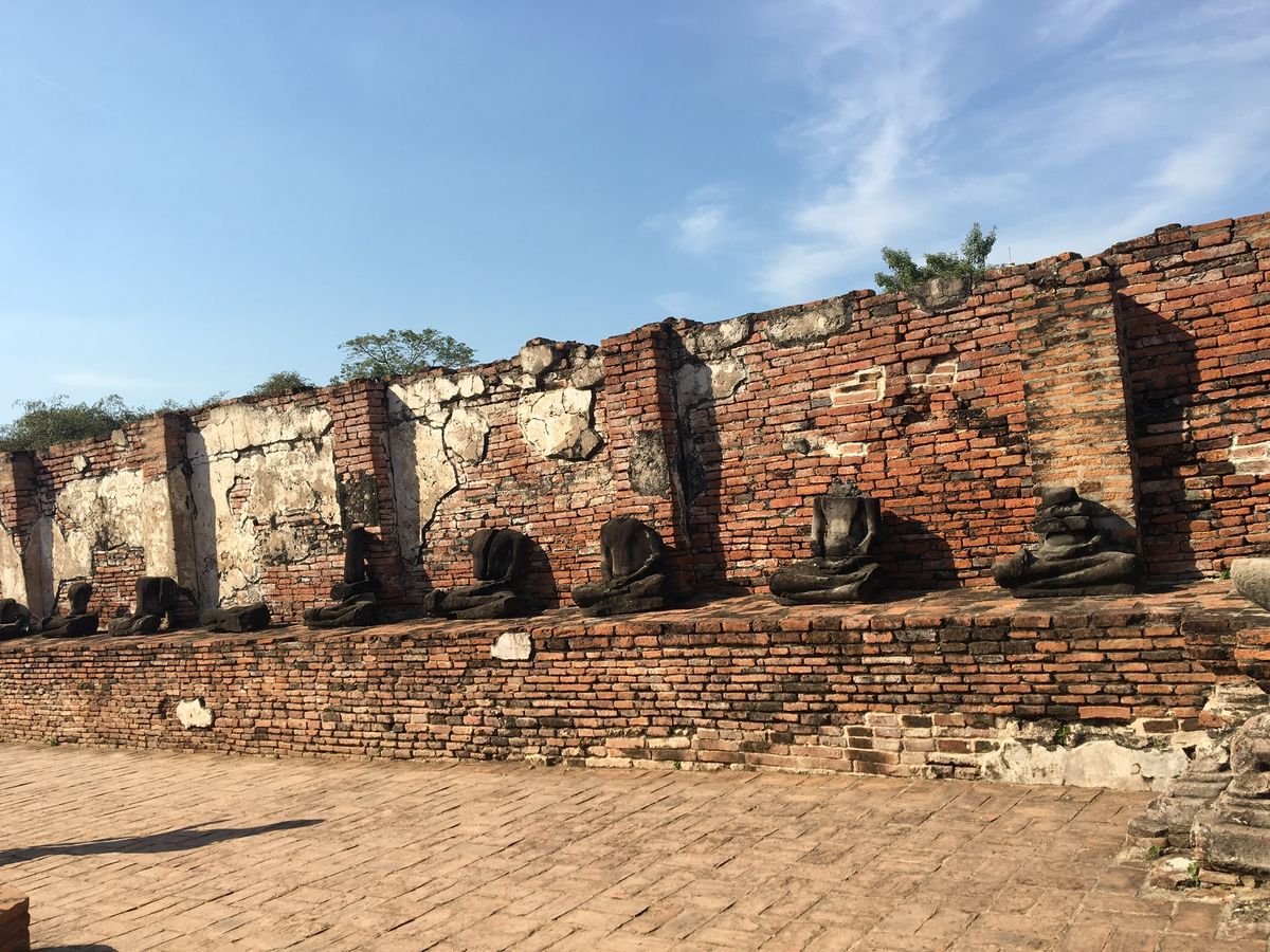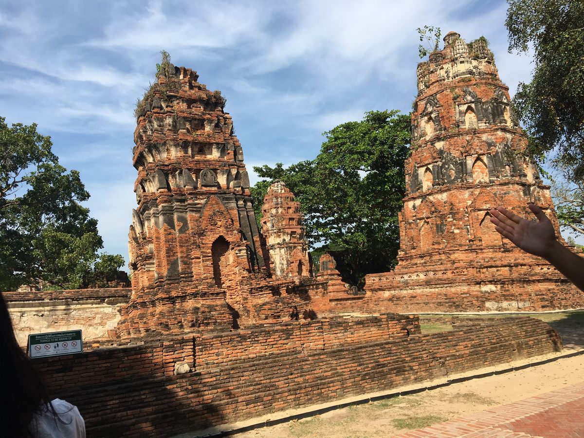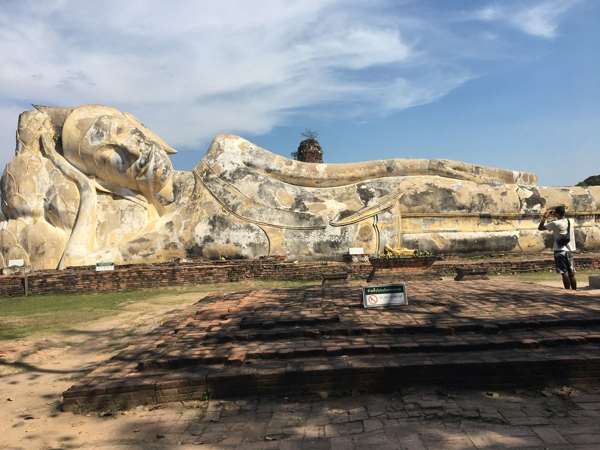 宿泊ホテルのロビーに、7時40分にお迎えに来てくれました。バンで出発。私たちが参加したツアーは7人が参加でした。最多でも9人くらいだそうなので、こじんまりしていていいです。ガイドさんは、日本の川崎に住んでいたことがある男性の方でしたが、流暢な日本語で説明してくださり、とてもわかりやすかったです。まず、渡し舟の乗り場までバンで行き、渡し舟に乗船。対岸なので、すぐに到着しました。初めに、三島由紀夫の小説のタイトルにもなったワット アルンへ行きました。全景を撮るには船から写真を撮るのがいいそうです。次にワット ポーへ。巨大な寝釈迦仏に圧倒されました。足の裏が凄いです。ここに入る前に、ガイドさんが一人一本ずつ水を配ってくれました。その後ワット プラケオへ。ここはとても混んでいるので、スリに要注意だそうです。服装もノースリーブや短パンは不可だそうです。本堂内部は撮影不可。撮影すると、データを消されてしまうので、要注意です。その後、ホテルで昼食バイキングを食べました。意外に綺麗なホテルで、バイキングの種類もサラダからデザートまで色々ありました。温かい麺を作ってくれましたが、スープは一種類でしたが、麺の種類は選べました。食べやすい美味しいものでした。昼食後、アユタヤへバンで移動。1時間くらいかかりましたが、渋滞もなく快適でした。アユタヤでも水を一本ずつもらえました。アユタヤは、ビルマ軍によって全てが破壊されてしまったそうです。天空の城ラピュタを思い浮かべるような景色が見られます。日影ごあまりなくとても暑いのですが。それぞれの寺院はバンで移動していくので、思ったより楽でした。いく先々で廃墟の都を見ることができました。ワット マハータートの木の根に取り込まれてしまった仏頭が有名ですが、想像より小さなものでした。アユタヤは物足りないと書いている方もいらっしゃりますが、私はタージマハルへ行った事がないので、楽しめました。