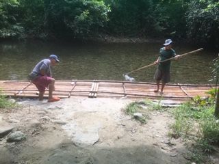 竹を組んだ筏に尻を川の水につけながら相棒と乗り、緩やかな、時折、急流(と言っても日本の川の比ではないが。。。)の水面をまったりと初めての筏下りを堪能しました。