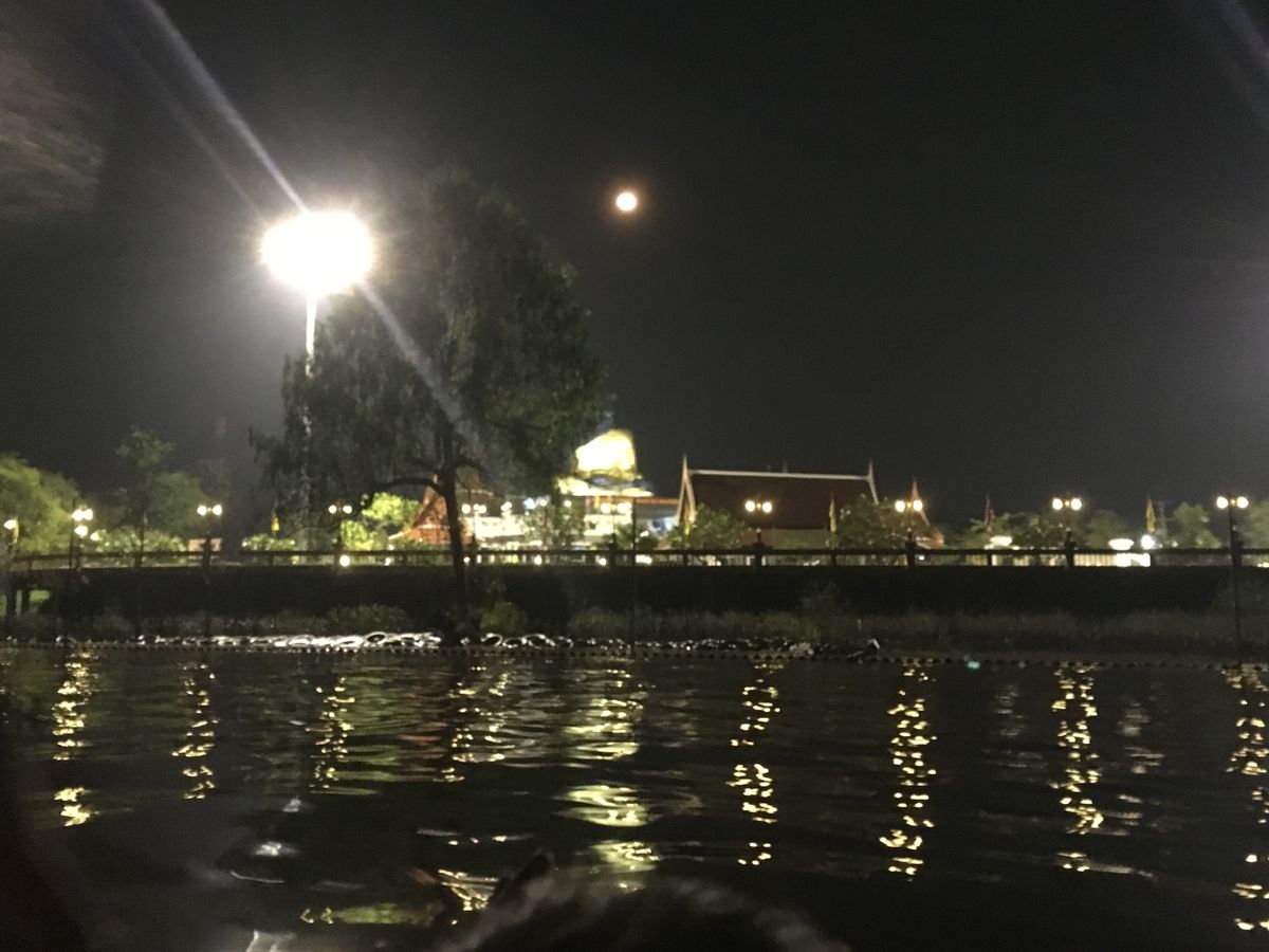 夜ご飯おいしくなかったのでいらなかったかな、、よく見たら「ライトアップされたアユタヤの景色をみながら」ってかいてたけどバスが目の前に見えました笑