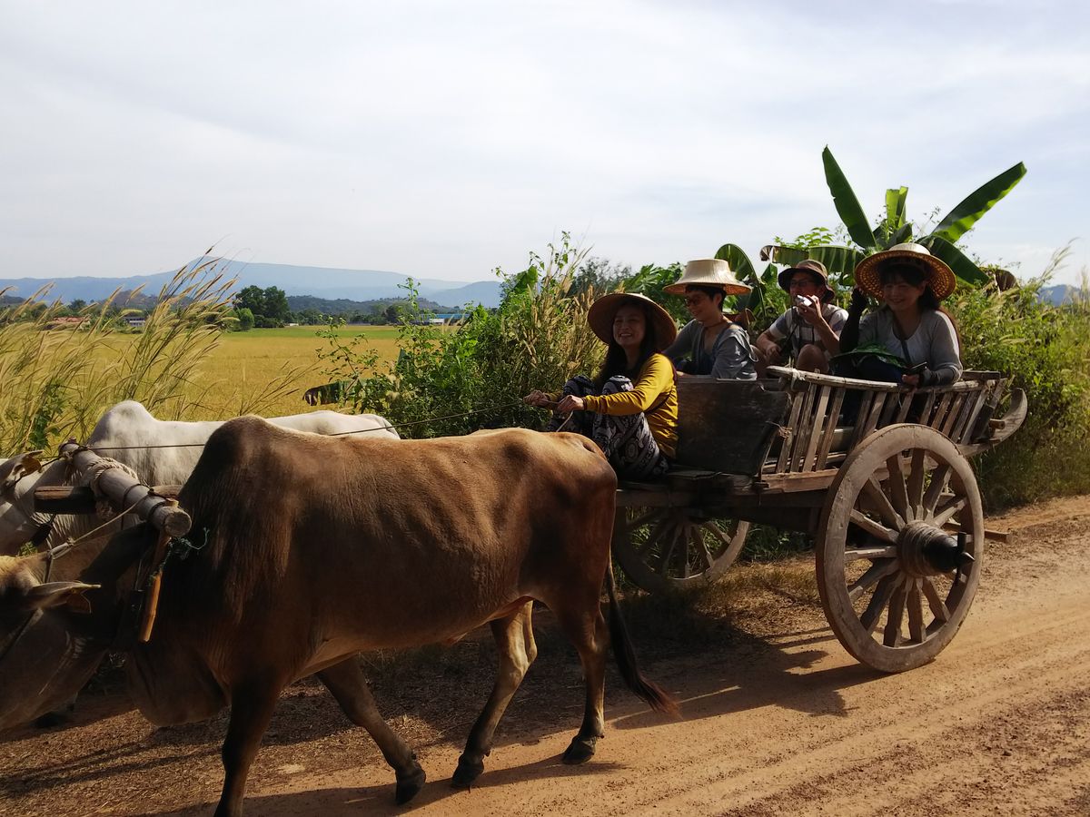 バンコクからかなり長い時間(三時間位)車に揺られ、まず牛車に乗りました。昔はこんな風に牛を使って農作業や車の代わりをしていたのかなと想像しました。12月は36度とかなり暑く牛車を引くおじさんは汗だくでした。