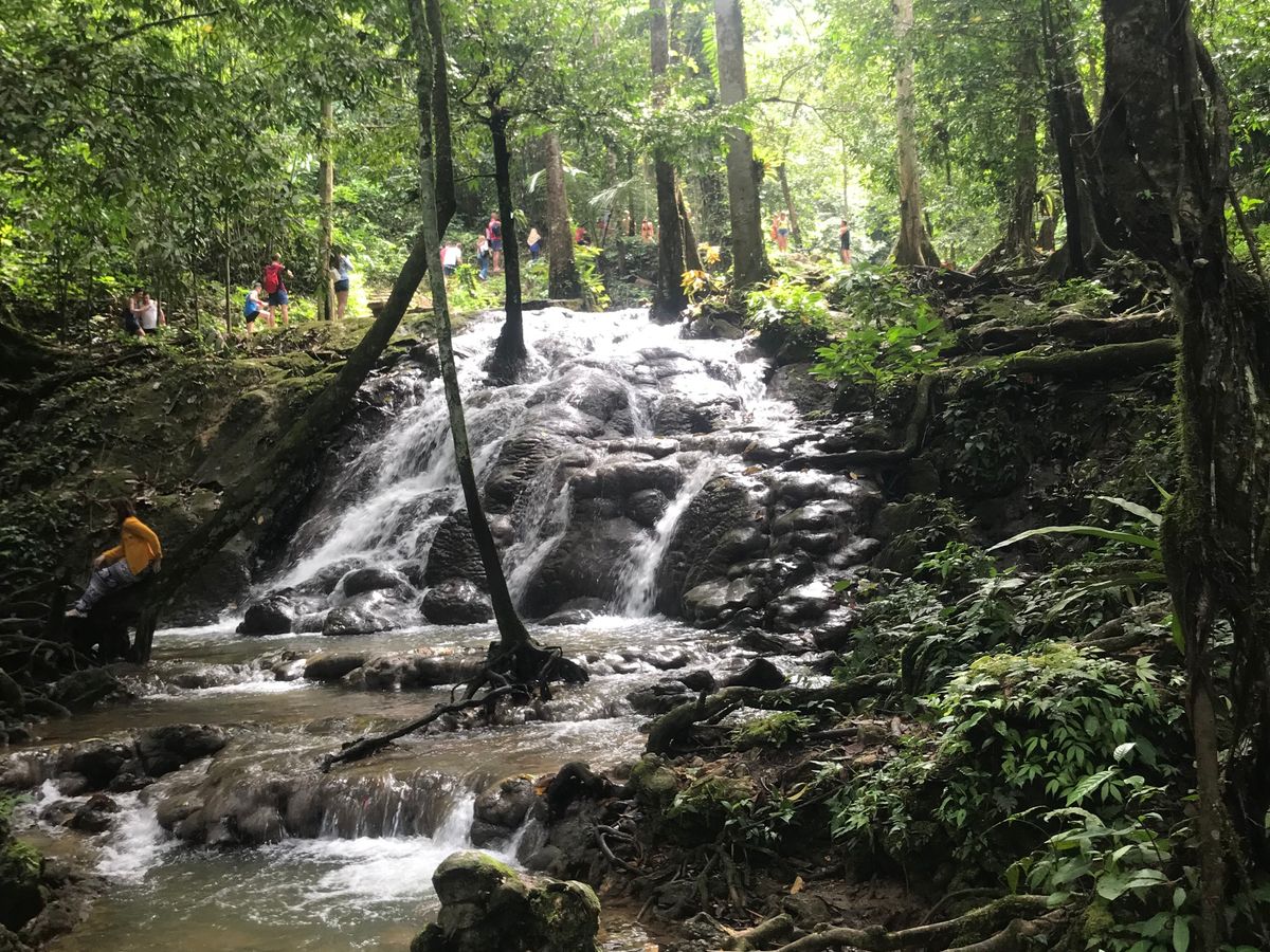 気温と湿度も高い中、トレッキングで滝近くに行く階段は踏み幅が狭く急であり、手摺りを摑まっての昇降が必要で大変であった。