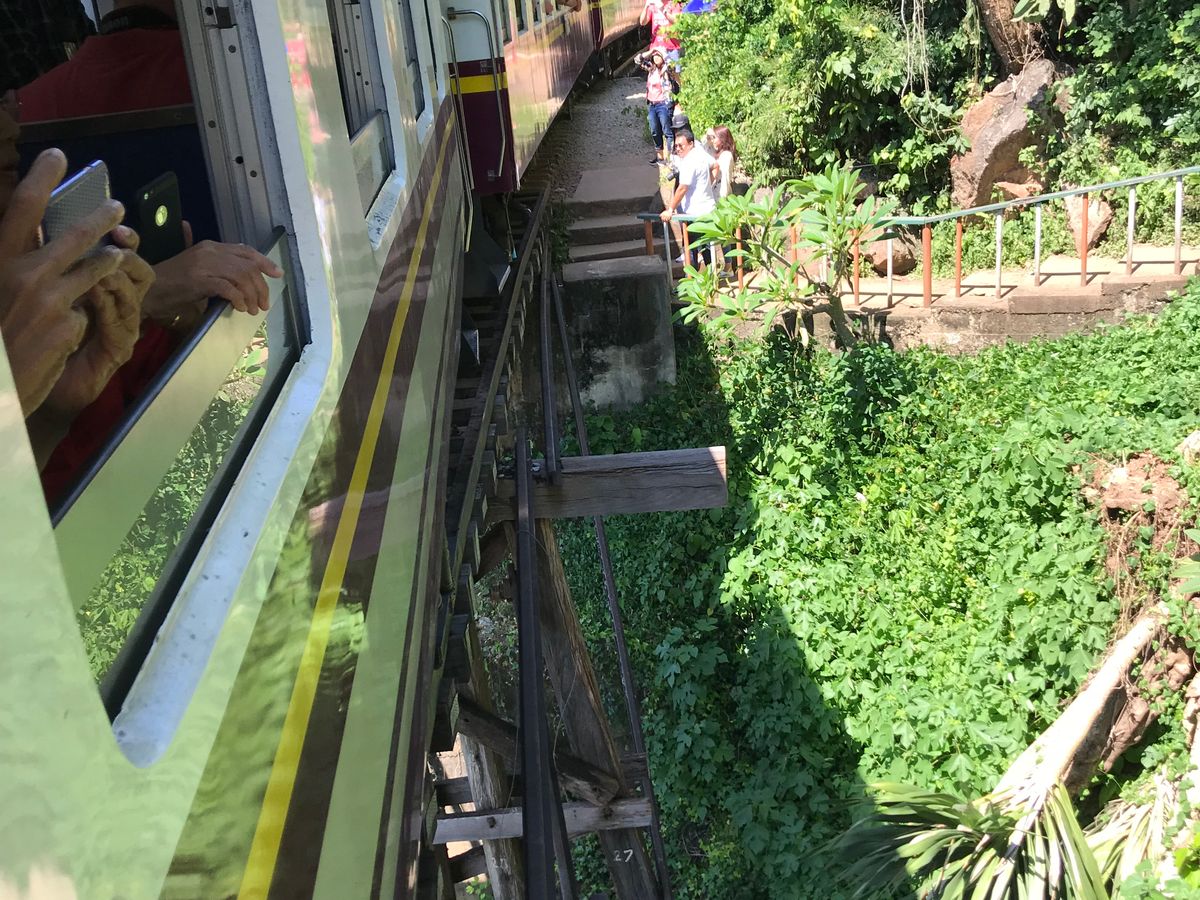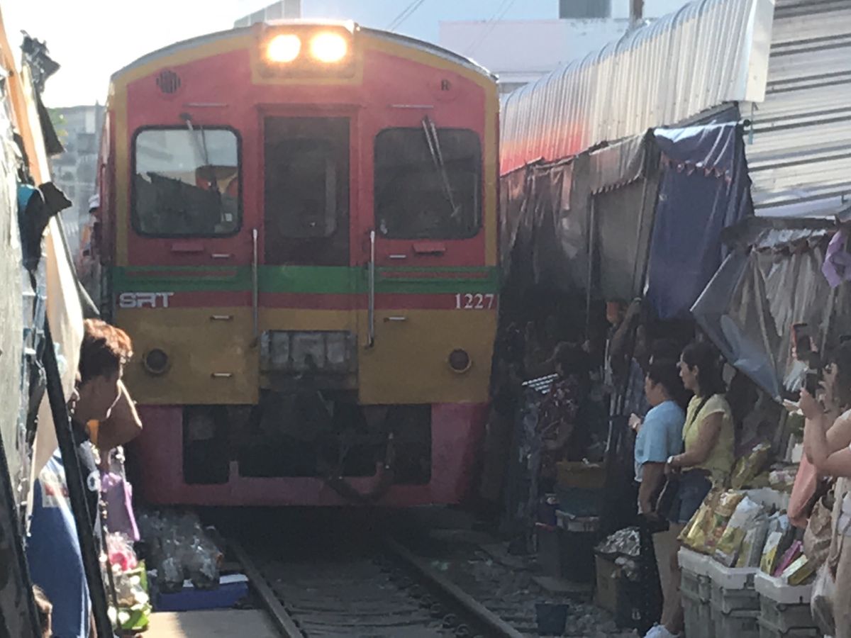 メークロン市場の電車は、轢かれるかと思うぐらい近かったです。電車が来る時間になると、観光客でいっぱいでした。