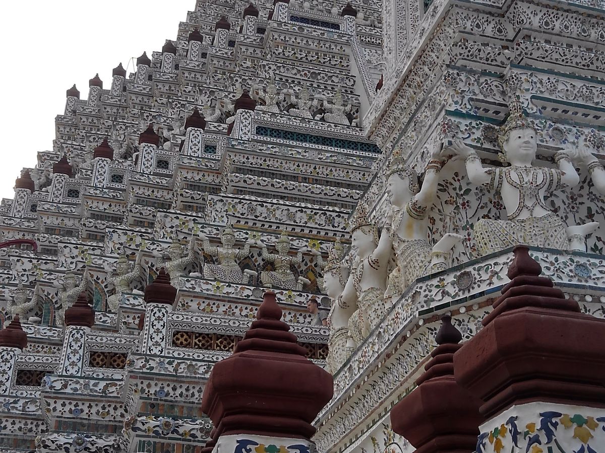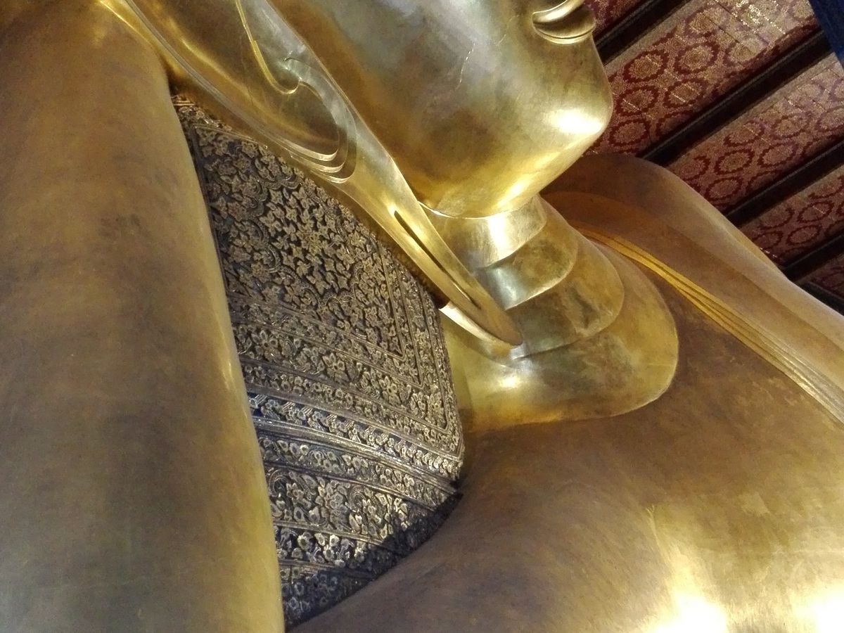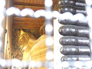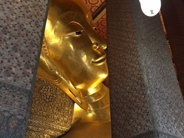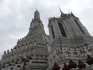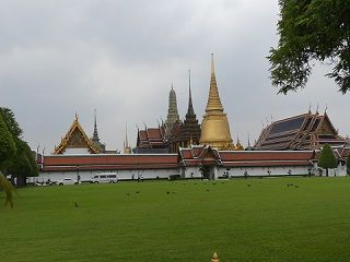 交通規制の関係からまずは王宮・エメラルド寺院(ワット・プラケオ)へ。団体客が沢山いたがすんなりと入場できた。雨季から乾季への変わりめであったがエメラルド仏の衣はまだ雨季のものだった。次いで涅槃仏寺院(ワット・ポー)へ。ここも混雑していた。涅槃仏を見るのは問題なかったが写真撮影スポットは2か所とも20人位並んでいたのでパス。金箔が美しい。足の部分は一部工事中であった。最後に渡し船で川を渡り対岸の暁の寺(ワット・アルン)へ。最初の急階段を昇り塔を一周。塔を囲む石像が見事。また来る機械があったら夜景も見てみたい。