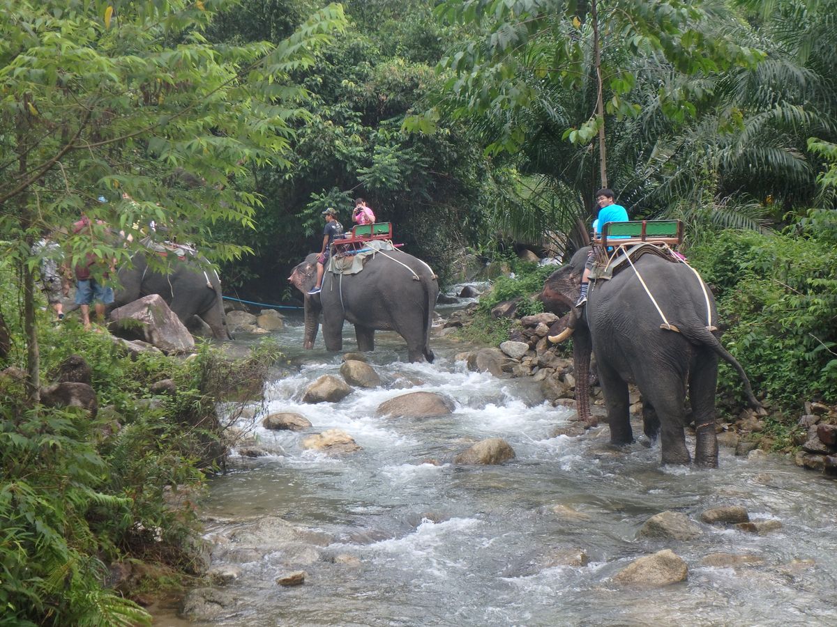 2人で座席に乗象し出発するも、象使いおらず。心配してると象の鼻を足場に下からちょんと頭の上に。途中、2人して頭(首)への直接乗りして大自然に突入。川の中もなんのその、土手を登り降りする時の傾きはスリル満点。