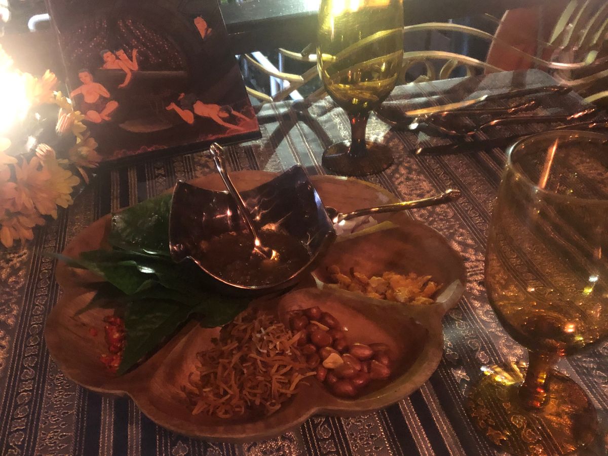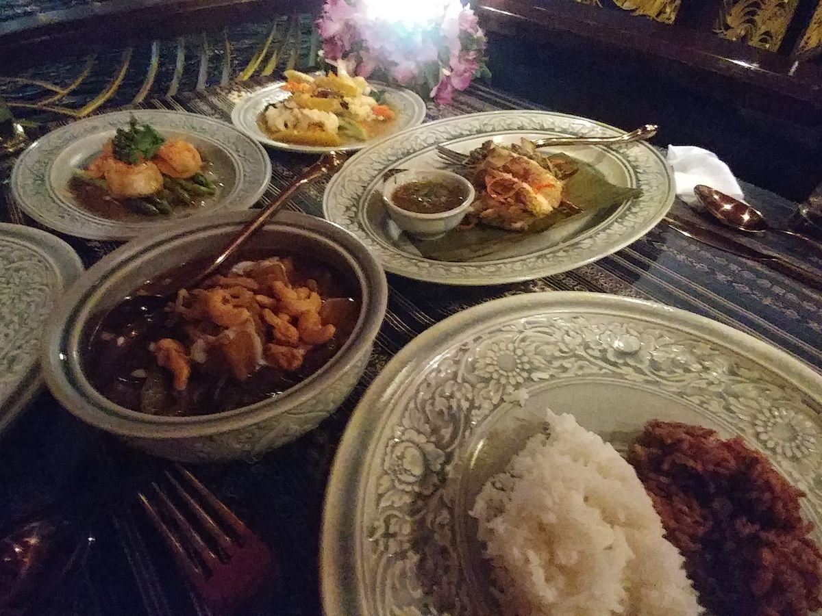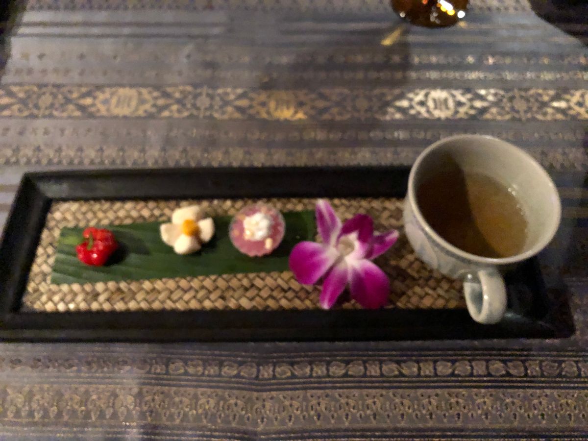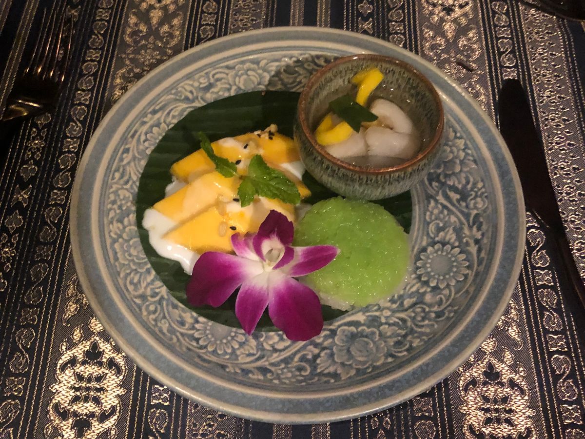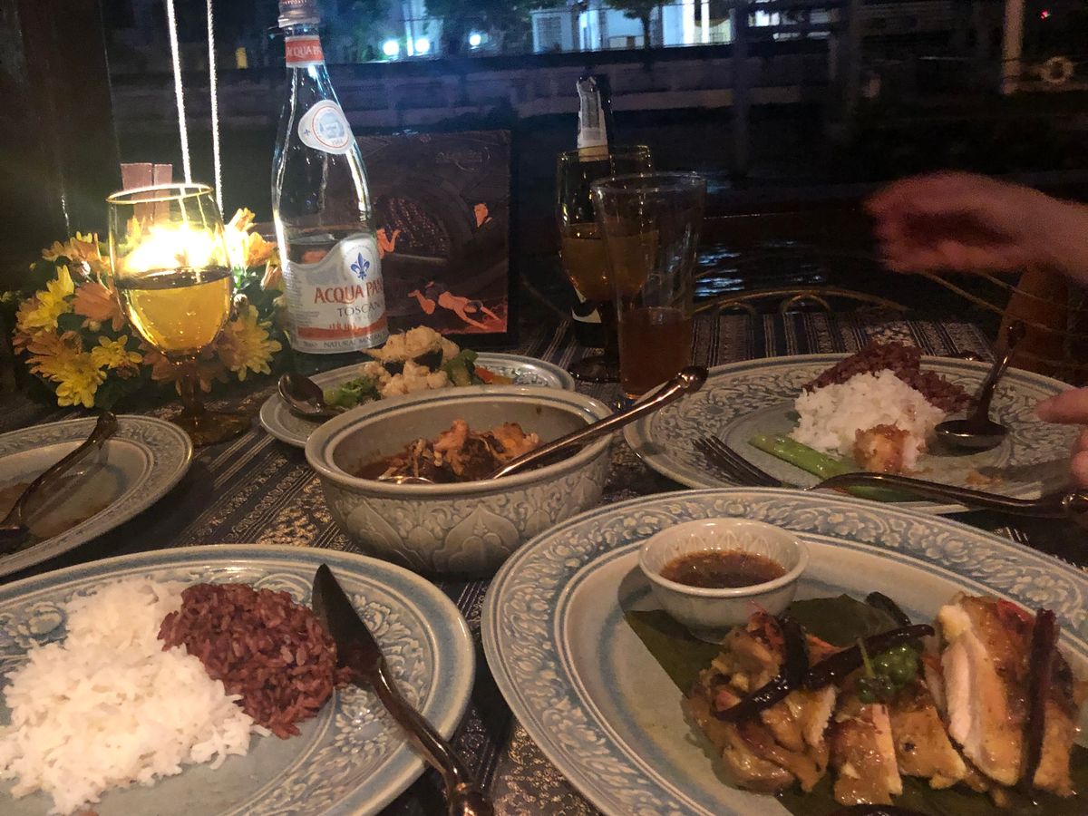 少ない人数設定で静かにコース料理を。という条件にぴったりでしたので、マノーラ号に決めました。乗船を待つ間も、アナンタラホテルのレストラン脇のソファーで、暮れゆくチャオプラヤー川を見ながら待つことができます。酔い止めを服用し乗船しましたがその日は酔うほど揺れず全く心配なし。アルコール類も(一応)避けました。満席でしたがなにせ人数が少ないし我々のお席はたまたま離れた場所でしたのでとても静かに景色とお料理を楽しめました。お味も盛り付けも器も美しく、サーブのタイミングも文句なし。最後はお腹がいっぱいで食べきれず申し訳なかったです。噂通り、マッサマンカレーはほんとに美味しかったですね。