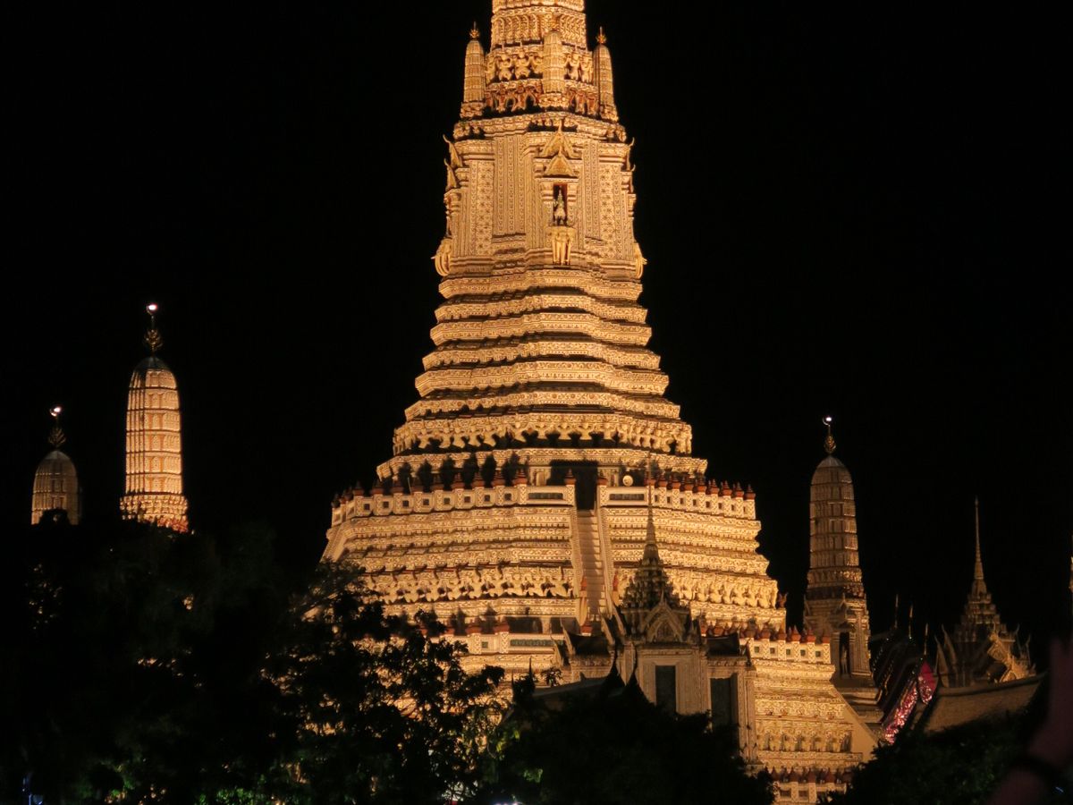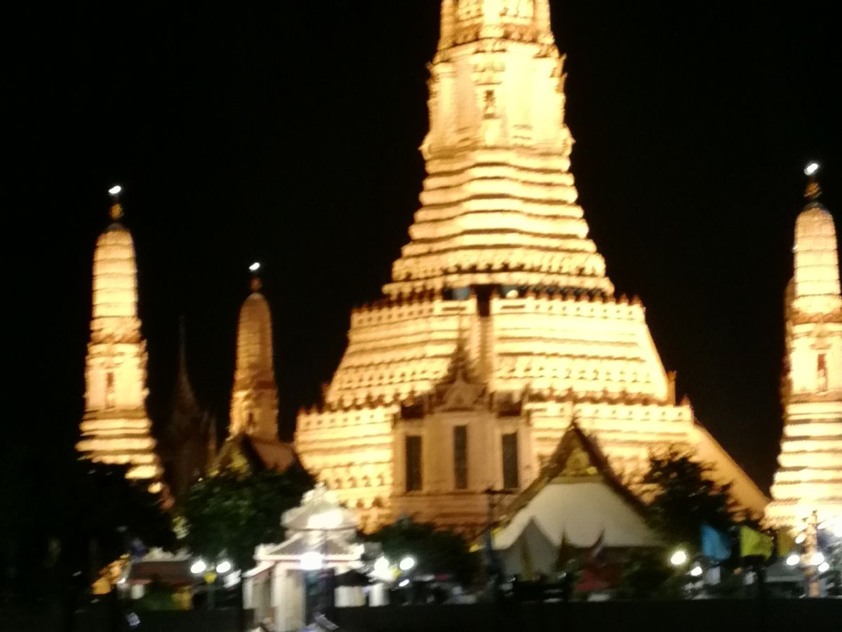 バンコクへ行ったら、半日市内観光の後に夜間のライトアップされたお寺を見るのが定番。バイキング料理も美味しく、さわやかな風にあたっての食事は最高です。