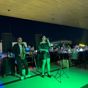 食事も済みバンドとお客さんが一体となってライブ会場のように歌い踊っていました。