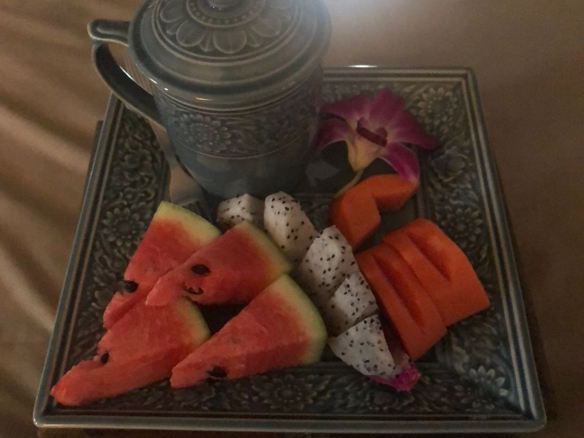 今回は全身のスクラブ、オイルマッサージ フェイシャル ミルキーバス 最後にお食事がついてきました。合わせて4時間のコースです。途中フルーツとお茶が出て、休憩を挟みました。