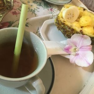 ロビーでは、暖かいレモングラスの効いたお茶と、可愛らしいパイナップルでできた器に入った蜂蜜のかかったパイナップルとバナナをいただきました。