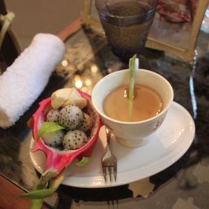 オイルマッサージの後のハーバルボールで暖められると体が ホッとします 施術のあとの フルーツも楽しみのひとつで 今回はかわいく盛られたドラゴンフルーツでした。