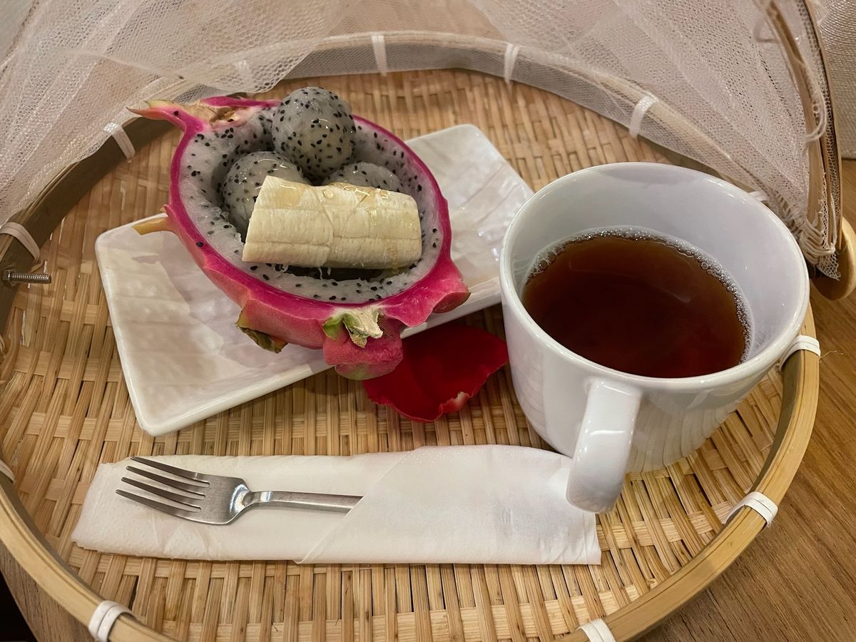ウェルカムドリンクはハーブティー的なもので、施術後にもドリンク(バタフライピーとレモングラスだったかな?)とお菓子(カボチャとジャックフルーツ?のドライチップス)をくださいました。