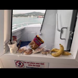 フェリー乗り場には朝早くから空いているコンビニがあり日焼け止めやスタバのカプチーノ何でも揃います(^^)大型船カタマラン号では軽食と飲み物が出るので朝からお腹いっぱいになれます。フェリーの中にはトイレ、エアコン完備で快適ですがデッキ席ではなく普通席でもなく2階にある特別室に着席
