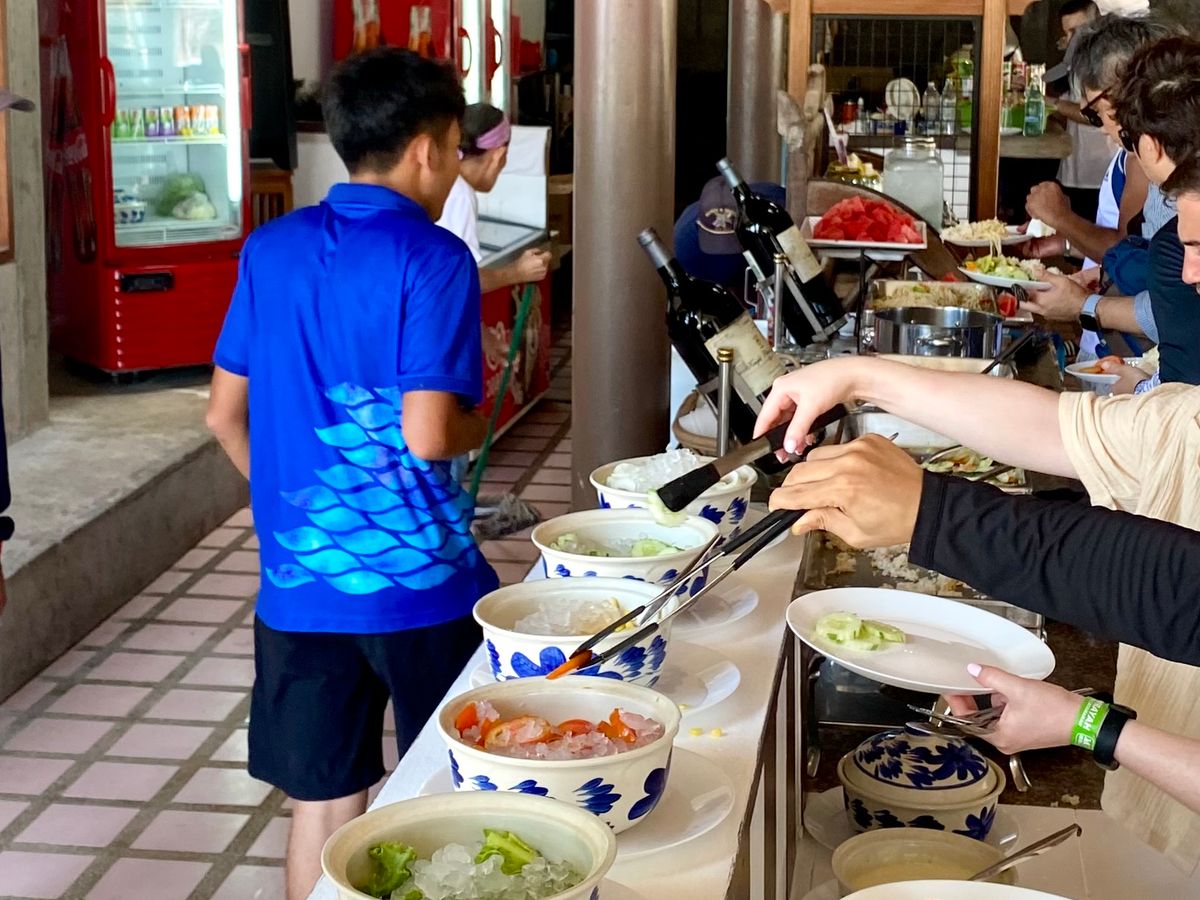 おかずを自分で食べたい量をとるという意味ではビュッフェですが、チキンタイカレー一択でした。カレーは、美味しいです。飲み物は水のみ(フリー)で他の飲み物はないので、ビール等を飲みたい方は、持参することをおすすめします。(ボート内にクーラーボックスが備え付けてあるので、冷やしてもらえると思います。)