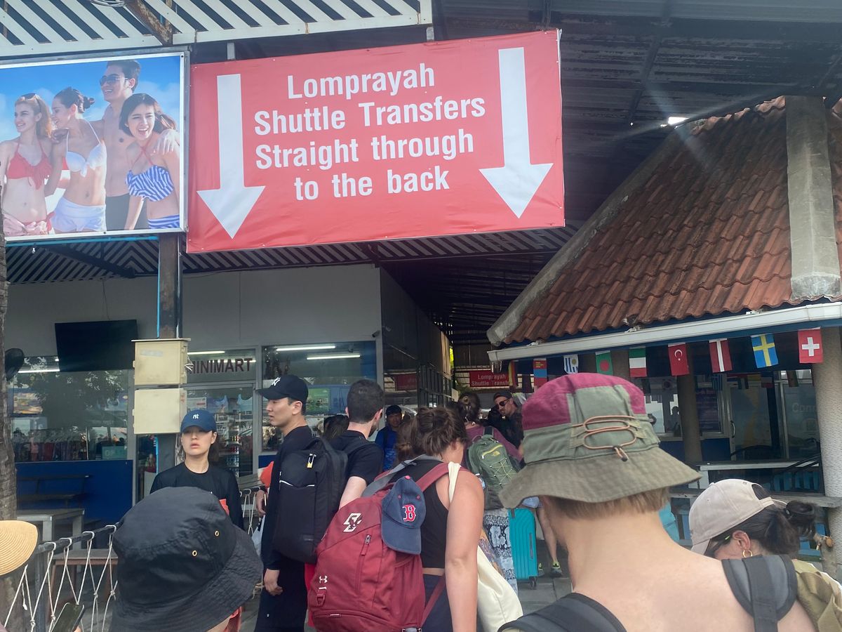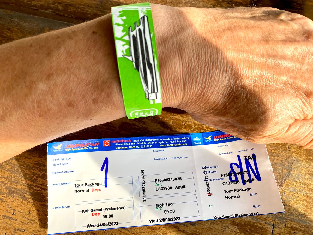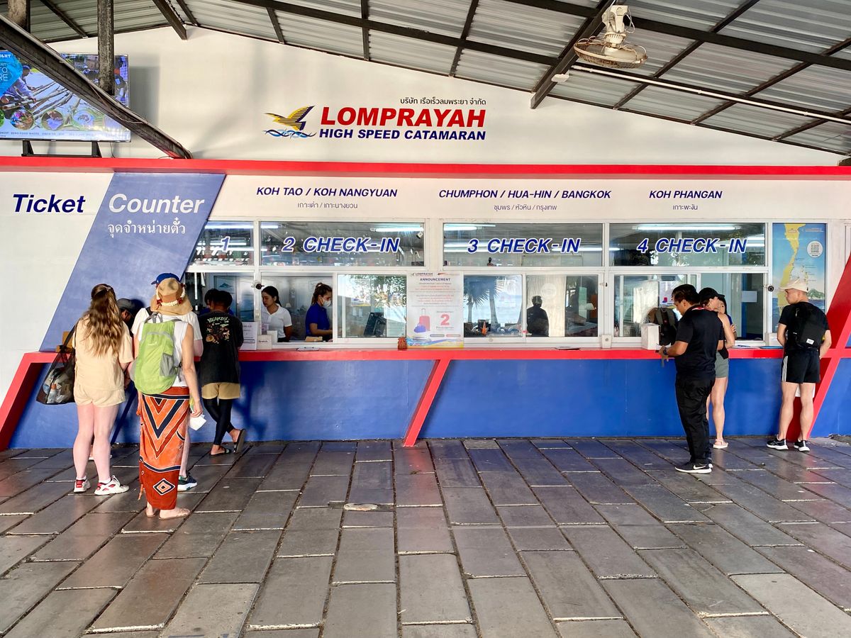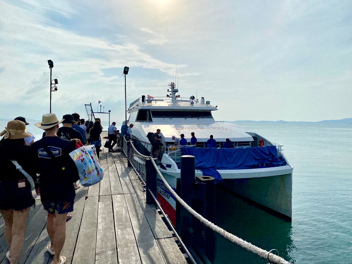 2日前に天気予報を見てから予約しました。6時30分予定のホテルお迎えシャトルは5分くらい遅れただけで、あと1件ホテルに寄って港のチケットカウンター前に7時過ぎ到着。1番カウンターに行くようにドライバーに言われました。韓国人団体が前にいて少し待ちました。カウンターでスマホを見せて入島料1人250Bを支払います。パスポートコピー持参と予約時のバウチャーに書かれていましたが、受付時に自分で用紙に名前、パスポート番号を記入すれば良いので、特にプリントを見せる必要は無かったです。