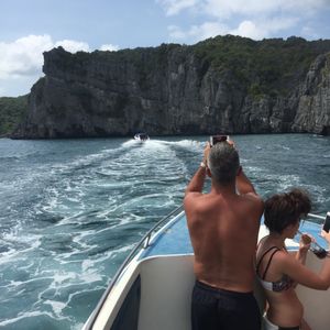 朝8時にピックアップ後、15分後にボート乗り場に到着。受付後にリストバンドを渡されてツアーごとにスピードボードに乗り込みます。乗る前に酔い止め薬をもらって飲みますが、ボードが思いのほか揺れて、なぜかボートの右側の人たちが一斉に船酔いで戻していました。まずはタオ島に到着し1時間くらいの滞在、ビーチチェアは150バーツ、ビールは100バーツです。その後昼食で他の島に到着、ビュッフェなのですが皆帰りのボートのことを考えて小食、ペットボトルの水はもらえます。その後、ナンユアン島に到着、こちらもビーチチェアは150バーツです。海の透明度はすごくきれいなのですが、砂ではなくサンゴの死骸なので足を怪我しそうなくらい痛くなるので足の保護用の靴は持って行ったほういいです。帰りも1時間30分くらいすごく揺れますので、船酔いしやすい方はちょっときついツアーです。