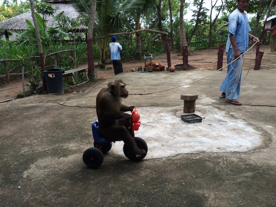 猿のショーは象に比べるとこじんまりしたもので、ココナッツの実を落としたり、回したり、自転車に乗ったり、腕立てしたりで終わりました。こちらもチップを渡せば猿と記念撮影させてもらえます。