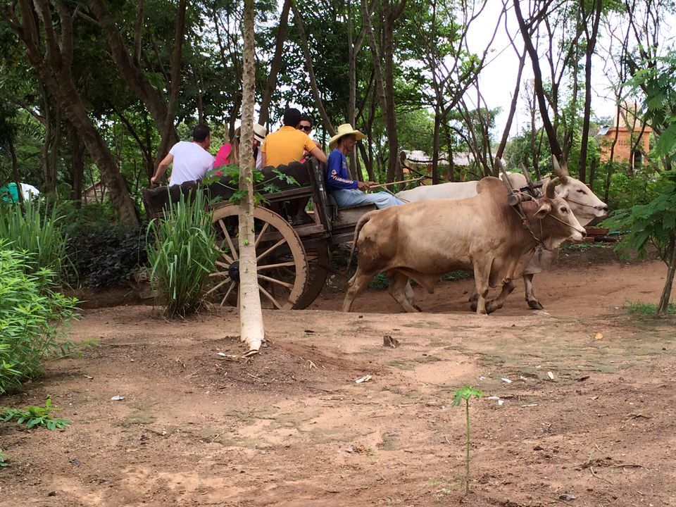 タイクッキングの会場の小屋に行くと、水牛ライドの待合場所も兼ねているらしく、まずは水牛に乗せてもらいました。200mくらいのトラックをぐるりと1周。なんとも言えない感覚です。