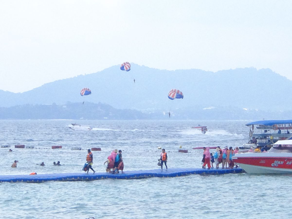 ビーチチェア(有料で100バーツ/脚)に案内され座って簡単な説明を受けました。ガイドさんが救命胴衣をとってこようとしたところ、パラセーリングがもう出発だと言われて慌てて移動でした。落ち着く間も無くいきなりパラセーリングでびっくりしましたが、後の状況を考えるとこれが正解でした。パラセーリングのインストラクターは日本語がほとんど通じない印象でしたが、アクティビティ自体はなんの問題もなくできました。黙々とハーネスを装着され空に放たれます。これが超感動の体験だったので、ぜひパラセーリングは体験してみるといいと思います。船上にスマホやカメラは持ち込み禁止なので写真は残っていませんが…