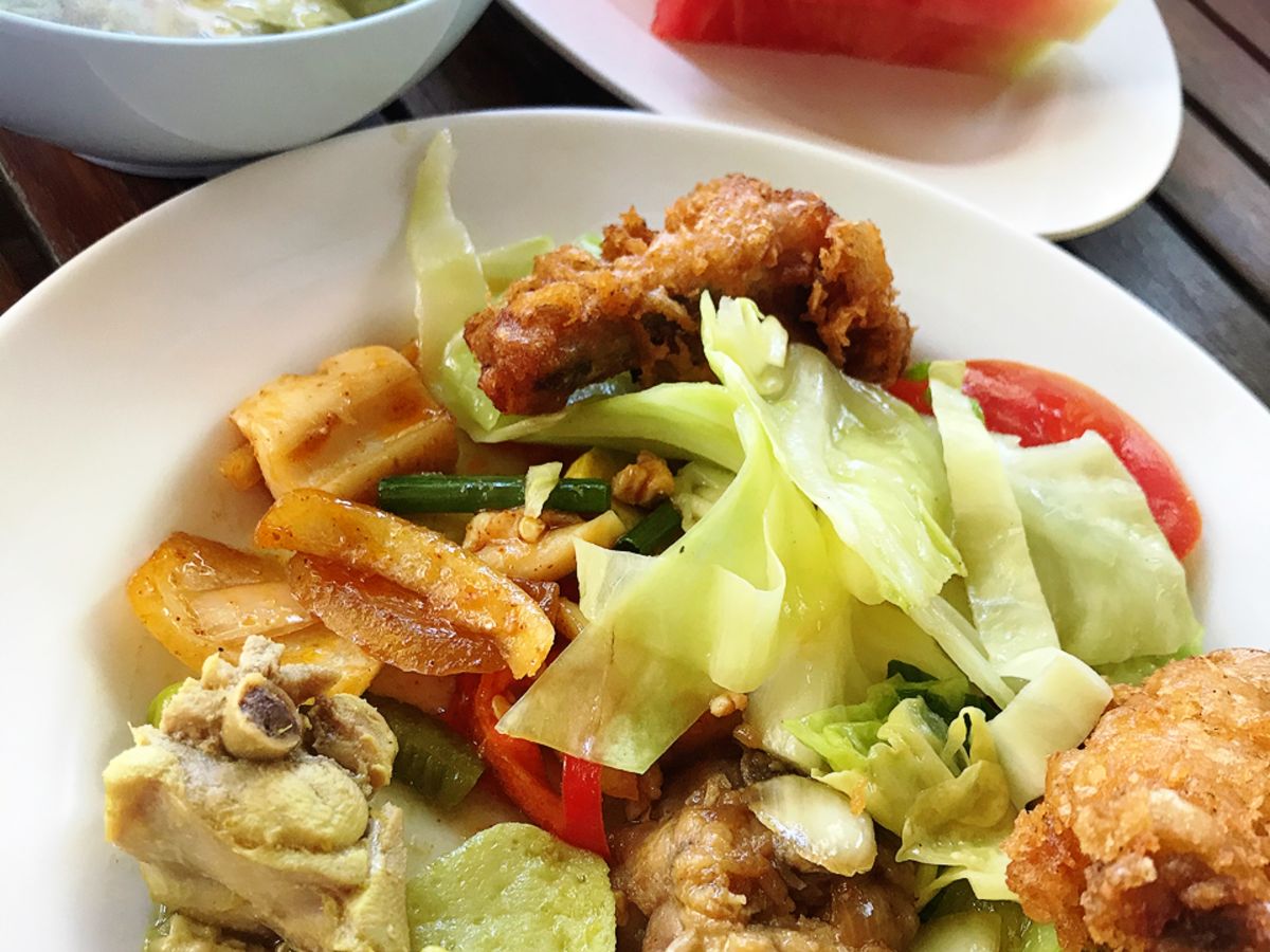 お昼ご飯のタイ料理もボリューミーで種類も豊富でとても美味しかっです。魚、お肉、野菜、スープに充実しており、味も自分で調節できるように辛いスパイスなども常備してくれていました。