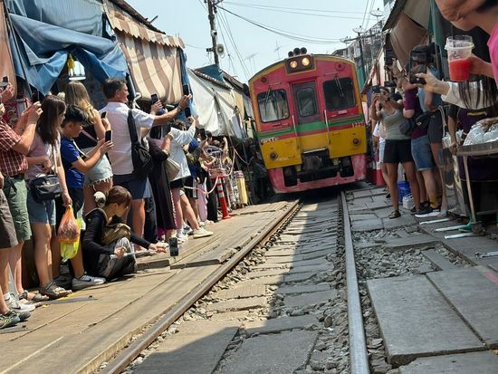 それからメークロン線路市場へ向かう列車に乗って電車の中から見える市場の様子は人もお店も電車スレスレのところにいてすごかったです!