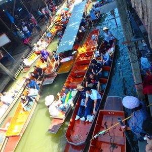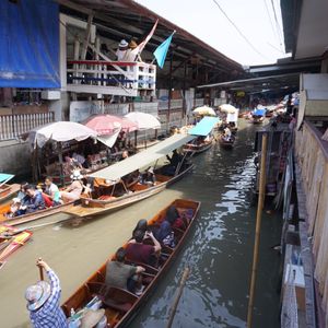 今回初めてのタイ旅行でした。集合時間が6時30分と朝早かったのと、集合場所が、2駅先であったので前日電車で下見に行きました。(日本とは切符の買い方が方少し違う)当日5名が遅刻していました。(昼から合流)まず1時間くらい先の水上マーケットを見学しました。観光客向けのマーケットでしたが、規模が大きく一度見学する価値があります。ココナッツに入ったアイスクリームとガイドさんの買ってくれたバナナのフライを食べましたがおいしかったです。